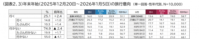 カレンダーの並びが良いことから、12月27日(土)から1月4日(日)までの9連休を取得できる人も多く、旅行意欲は前年より高まった。アンケートでは「行く」と回答した人が25.1%と、前年から2.4ポイント増加した。特に若年層を中心に旅行意向が強い結果となった。