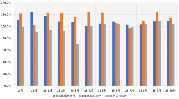 観光庁が公表した2025年10月の主要旅行業者取扱状況速報によると、総取扱額は4021億円で前年同月比106.5%となり、海外・訪日・国内のすべてが前年を上回った。海外旅行は1344億円で109.3%、訪日旅行は291億円で114.3%、国内旅行も2387億円で104.1%となり、旅行需要の広がりが市場全体を押し上げた。