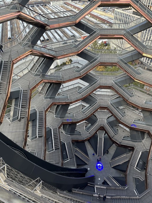 また、エッジのある30ハドソン・ヤードの前には新名所「ベッセル」が建つ。階段と踊り場が組み合わされたデザインのモニュメントで、言ってみれば超巨大なジャングルジムのよう。迷路のように40メートル以上も昇り降りをする必要があるので体力や足腰には要注意だが、他の展望施設とは異なるスリルを味わえる。