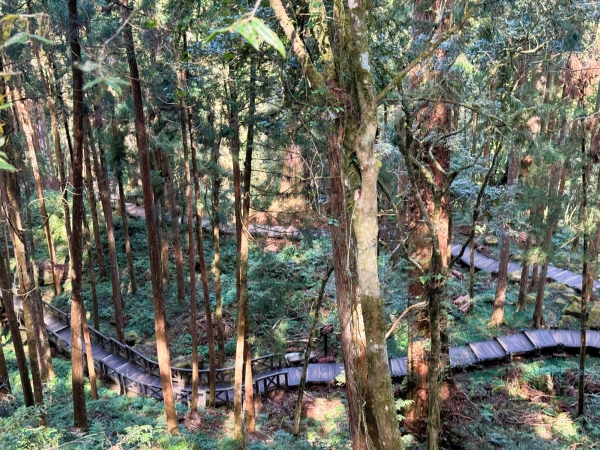 朝食後、ホテルに荷物を預け、目の前のハイキングロードへ。遊歩道が整備されている。巨木群を歩くコースや、池を目指すコースなど多岐に渡る。アップダウンも遊歩道の階段になっていて歩きやすい。ただし、空気が薄いので、登りは肺にこたえてしんどい。訪れたのは11月だったが気温が20度あり(台南は30度)、風もなく、歩くと暑いので、ずっと半袖であった。当日の気候コンディション次第で持ち物を変えたいのがハイキングだが、その日の気候で不要な荷物は全てホテルに預けられるのが便利。