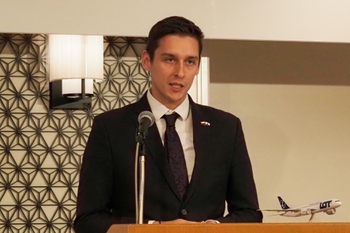 また、国土交通副大臣の酒井庸行氏も登壇し、「コロナ禍の厳しい状況の中でも路線を維持し、日本とポーランドの空の架け橋を守り続けたことに心から感謝したい」とコメント。「両国の関係をこれからもっと強くしていきたい」と述べた。