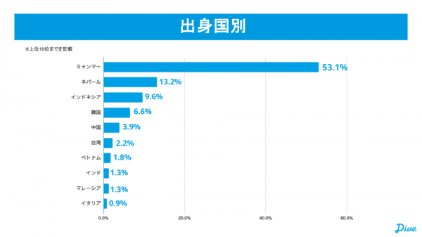 就業者の国籍はミャンマー出身者が約半数を占め、ネパール、インドネシア、韓国、中国、台湾、ベトナムなど、東南アジア・南アジアを中心に多様化している。性別構成は女性が54.8%、男性が45.2%で、特定の国籍や性別に偏らず、観光現場のニーズに応じた人材配置が進んでいる点も特徴だ。