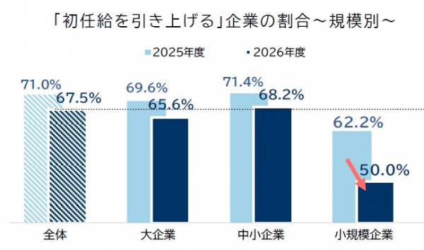 一方、引き上げを見送る企業は32.5%に増加した。既存社員との賃金逆転への懸念や、全体の賃上げに踏み込む余力の不足が主な理由。特に中小企業では、仕入価格や社会保険料の上昇が重荷となり、初任給のみを引き上げることの難しさが指摘された。前年度に引き上げたことから今年度は据え置くとする企業も一定数みられる。
