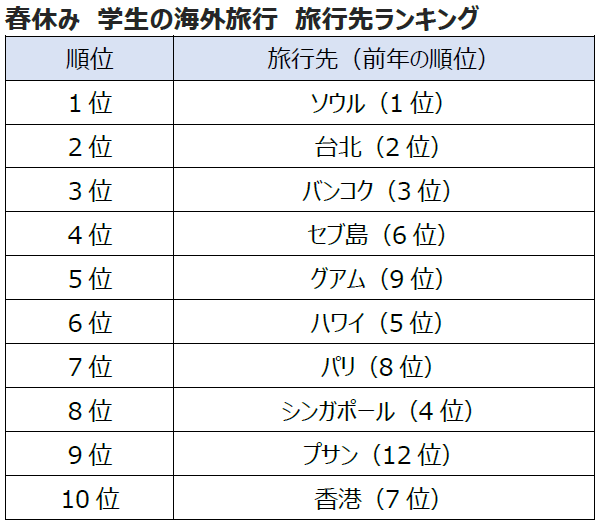 HISは20日、2月から3月出発の予約状況をもとに、春休み期間における学生の海外旅行動向を発表した。予約者数は前年と同水準で推移し、平均単価は前年比107.1%の14万700円と上昇した。物価高や円安の影響を受けつつも、学生の海外旅行意欲は堅調であることが示された。