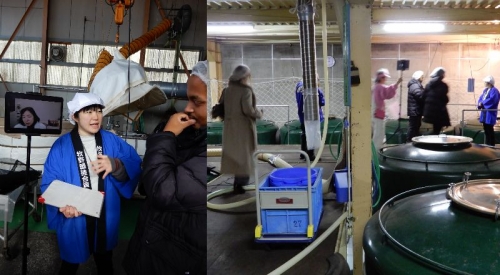 テーマは「地元民と巡る、食文化テロワールツアー」であり、富士宮PRをされている宮ガールさんが構成の手伝いとガイドを担当。まず、280年間富士宮で酒造を営む「牧野酒造」を訪れ、日本酒の醸造過程を見学、最後に試飲も提供される。移動はハイヤー会社と連携し、通訳はインターネットを通してオンライン通訳を駆使していた。