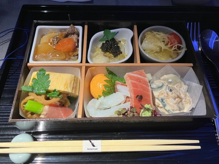 フルフラットで、座席に引っ掛けて敷く厚みのあるシーツと掛け布団は事前に席に置かれている。機内食は、夕食、フライト中の軽食(希望による、サンドイッチか冷やしうどん)、到着前の軽食(サラダ・キッシュか焼きうどん・デザート)。ギャレーにはクッキーやスナック類が置かれていつでも取れる。