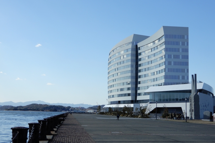 曲線を取り入れた外観は、海峡と街に馴染むデザイン。車で山口宇部空港から約60分、北九州空港から約40分。最寄りの下関駅まで博多駅から電車で約1時間。