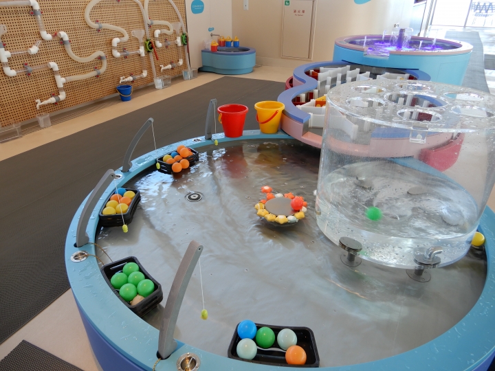 「ふぐプール」内にある水の流れを利用したさまざまな遊具。パイプで水の流れを変えたり、磁石の魚釣りをしたりと楽しめる。