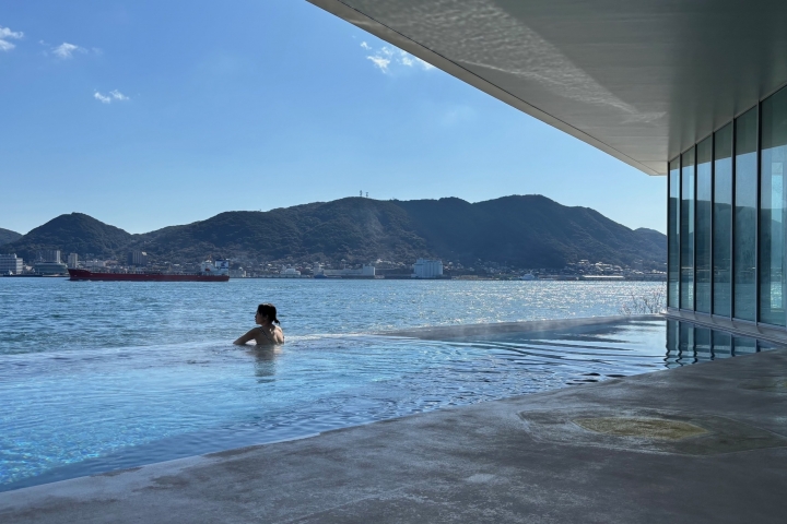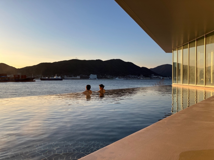目の前の関門海峡と一体になったようなインフィニティプール。海水を利用して電解による減菌で塩素臭を低減。2月でも心地よく入れる水温だった。