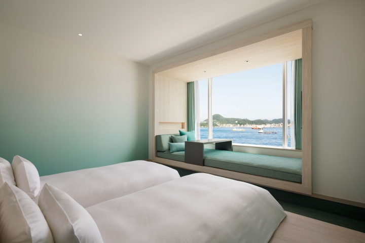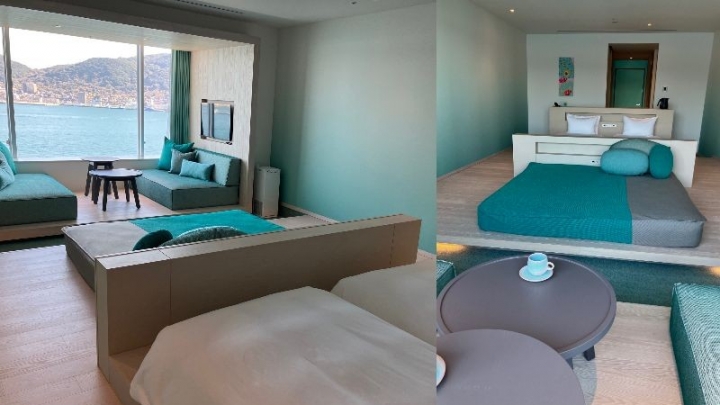 スーペリア(38㎡、4名定員、2万1000円~):窓際にはデイベッドソファがあり、行き交う船を眺めてくつろげる。