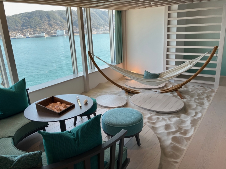 海峡カバナスイート(76㎡、4名定員、5万円~):リビングには砂浜があり、ハンモックも設置されて、プライベートビーチのよう。