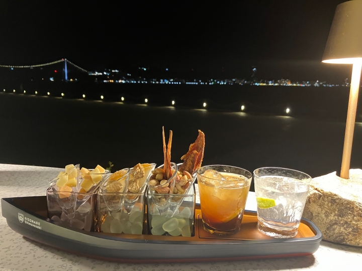 夜には、コンテナ船のモチーフのトレイにふぐや柑橘を使ったおつまみとドリンク2種(ノンアルコールもあり)を乗せた「海峡ナイトラウンジセット」を楽しめる(3600円)。